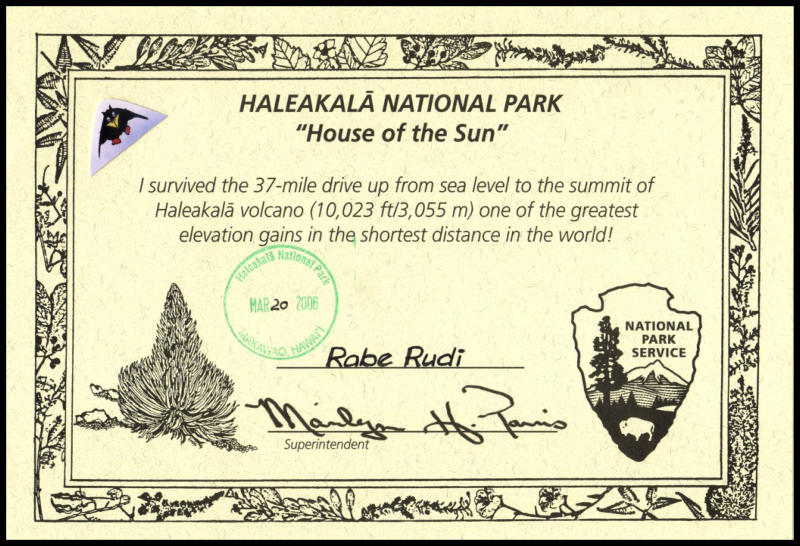 Rudis Zertifikat vom Haleakala National Park